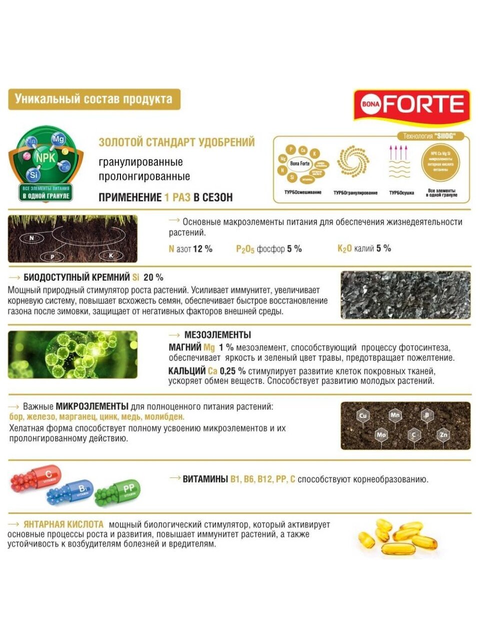 Удобрение Газонное с биодоступным кремнием Bona Forte произведено по уникальной передовой технологии "SIIOG", обеспечивающей важные качественные преимущества перед традиционным смешением: