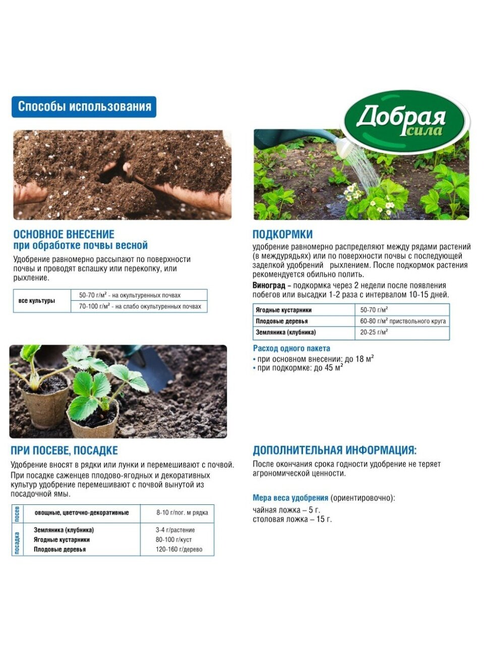 Удобрение Фрукты-Ягоды, 900 г, Добрая сила — идеальный выбор для обильного урожая и активного роста плодовых деревьев и ягодных культур. Органоминеральная формула в гранулах способствует быстрому усвоению питательных веществ, ускоряет плодоношение и повышает урожайность. Применение весной и осенью обеспечивает растениям необходимую поддержку в ключевые периоды вегетации.