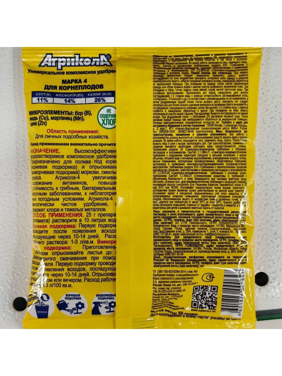 Предназначено для подкормки моркови, свеклы, редиса и других корнеплодов. Удобрения включают полный сбалансированный набор макро- и микроэлементов, не содержат хлора и тяжелых металлов. Правильный состав, учитывающий потребности растения в тот или иной период роста, своевременные подкормки удобрениями Агрикола препятствуют образованию нитратов в растениях.