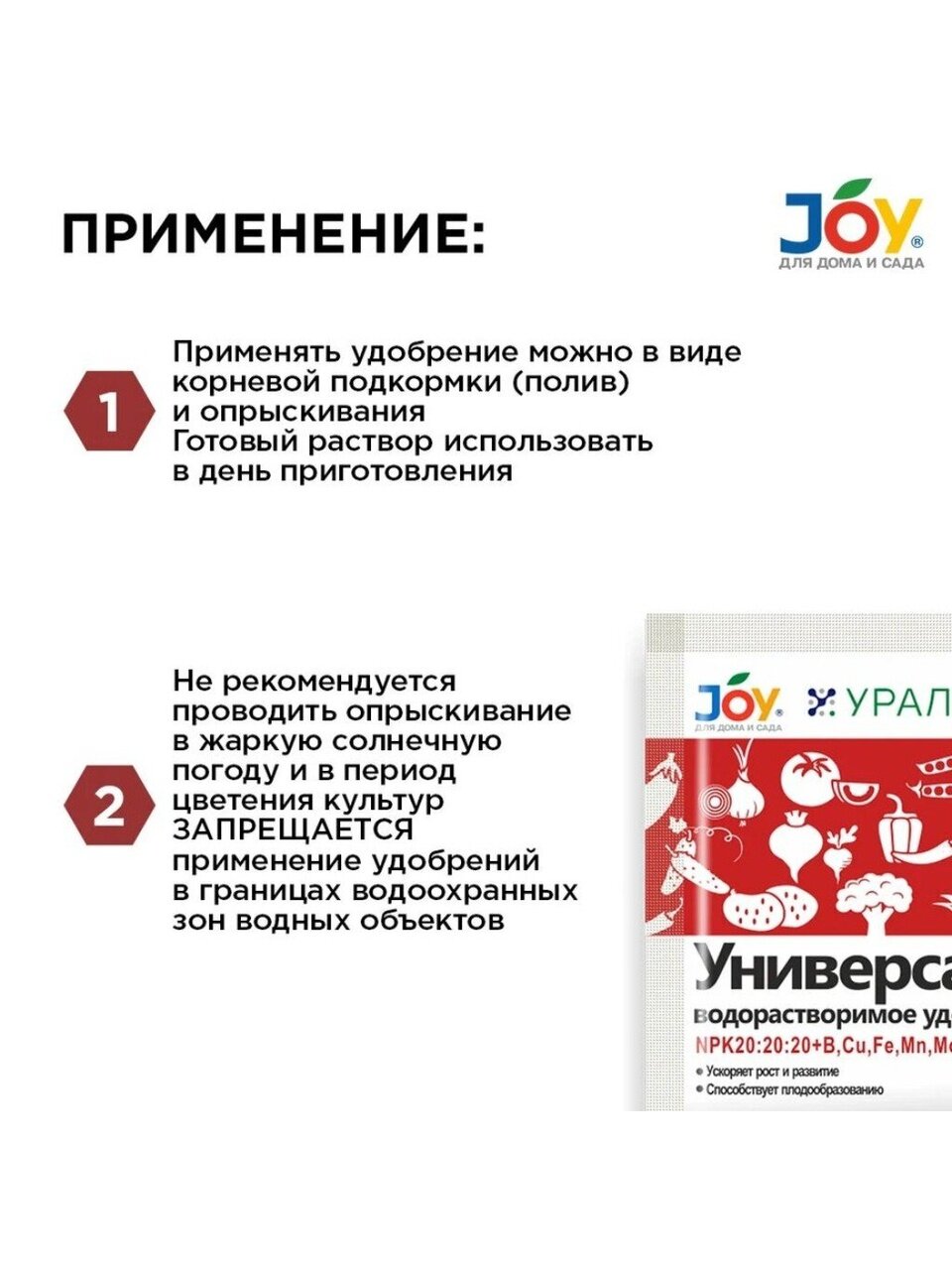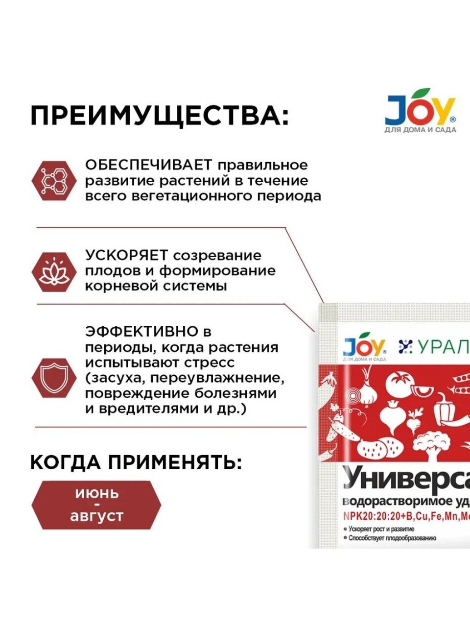 Удобрение водорастворимое JOY "Универсал" хорошо повлияет на развитие ваших растений. Благодаря такой помощи любой кустарник, корнеплод или цветок будет сильным, здоровым, а урожай — великолепным.
