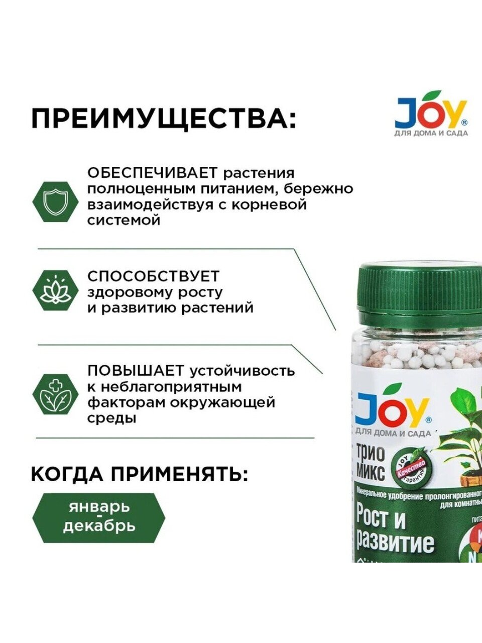 Способствует здоровому росту и правильному развитию растений.
