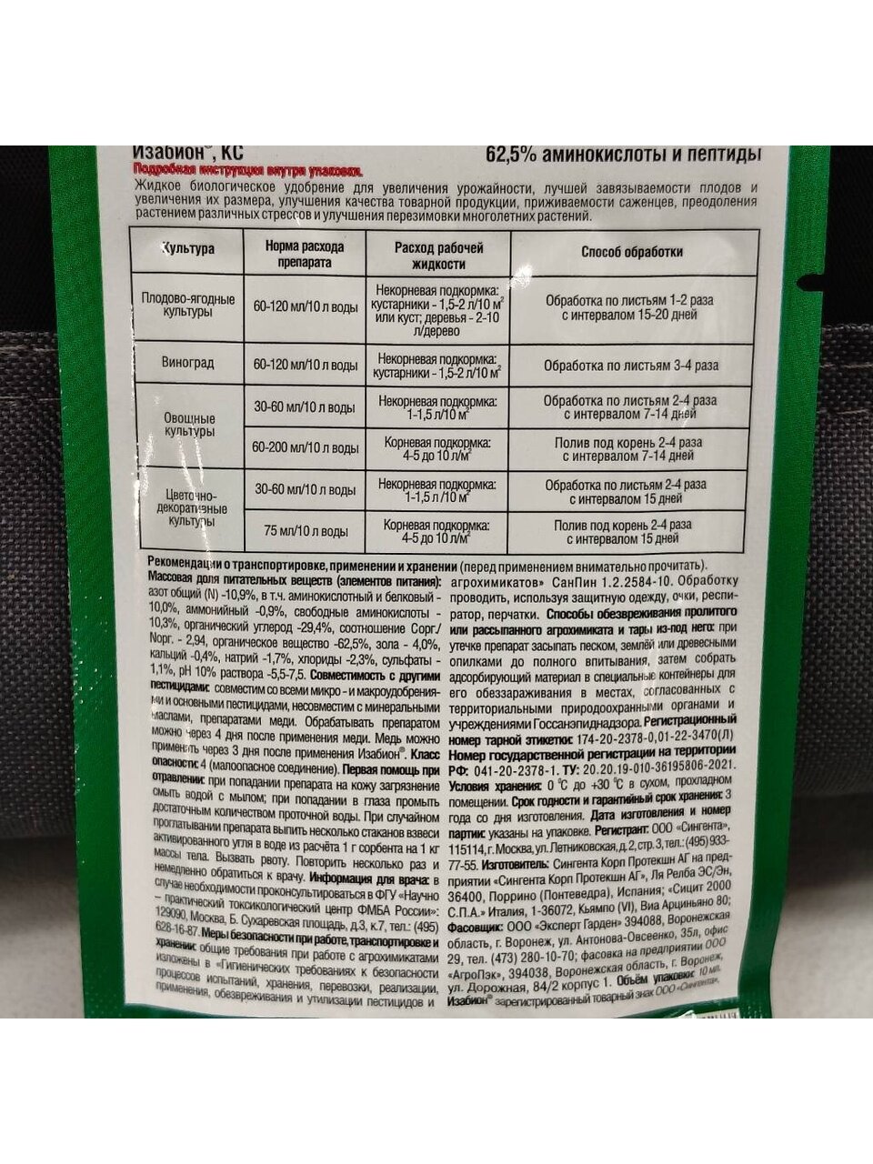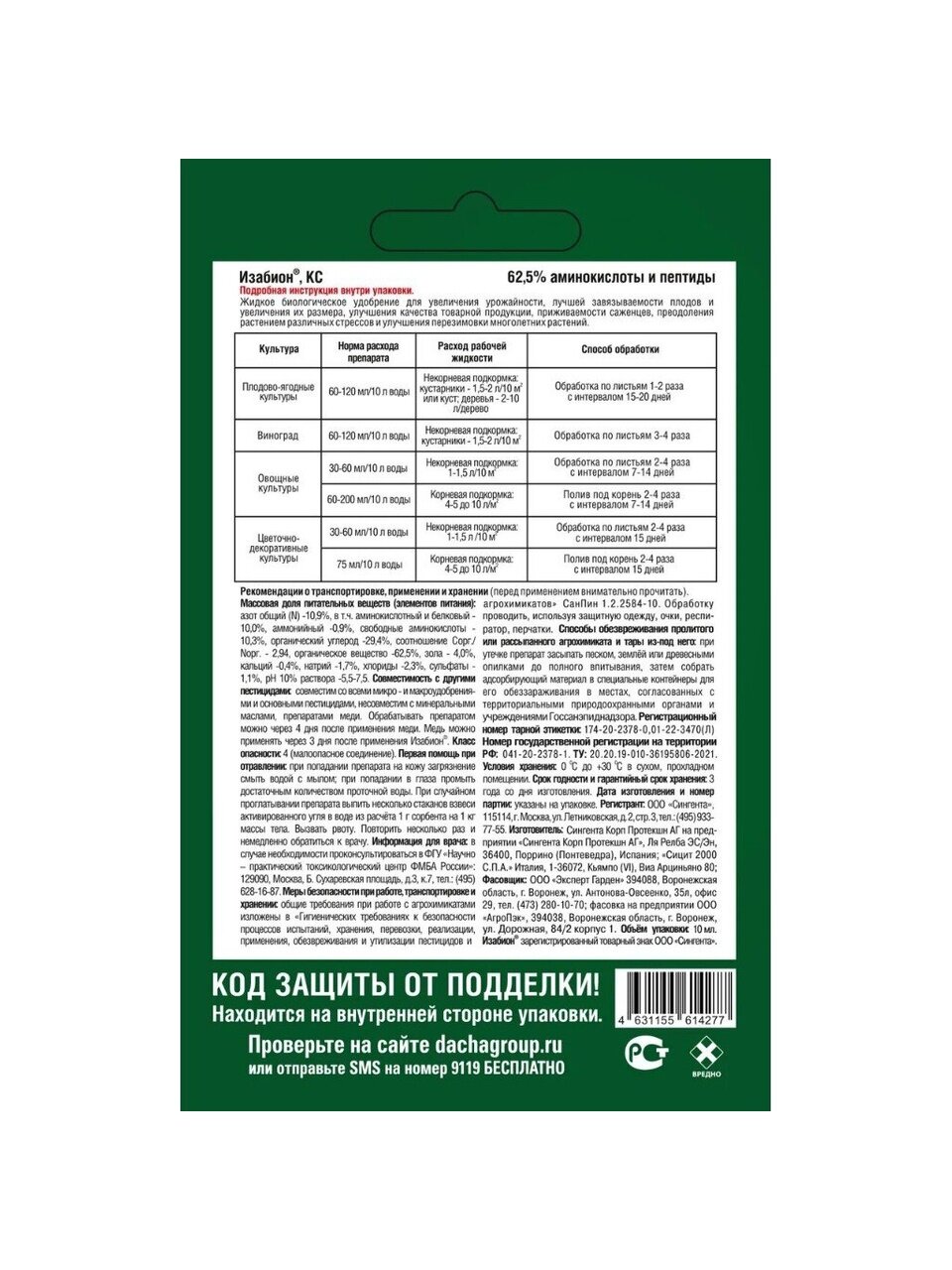 Изабион - органическое удобрение и биостимулятор роста для всех культур. Применяется в наиболее важные фазы развития растения в открытом и закрытом грунте, для молодых насаждений. Повышает урожайность, а также усиливает сопротивляемость стрессам (заморозкам, засухе, болезням, физиологическим нарушениям), а также снижает стресс от применения пестицидов и засоления почвы. Безопасен для окружающей среды, человека. Плоды и овощи можно употреблять в пищу сразу после обработки.