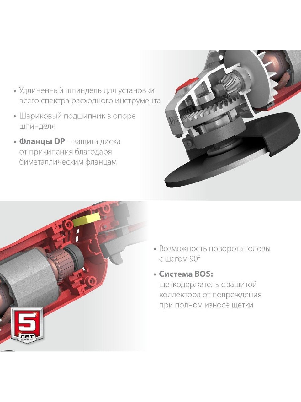 - УШМ оснащена специальной системой BOS, которая предотвращает повреждение коллектора двигателя даже при полном износе щеток, что гарантирует продолжительный срок службы инструмента.