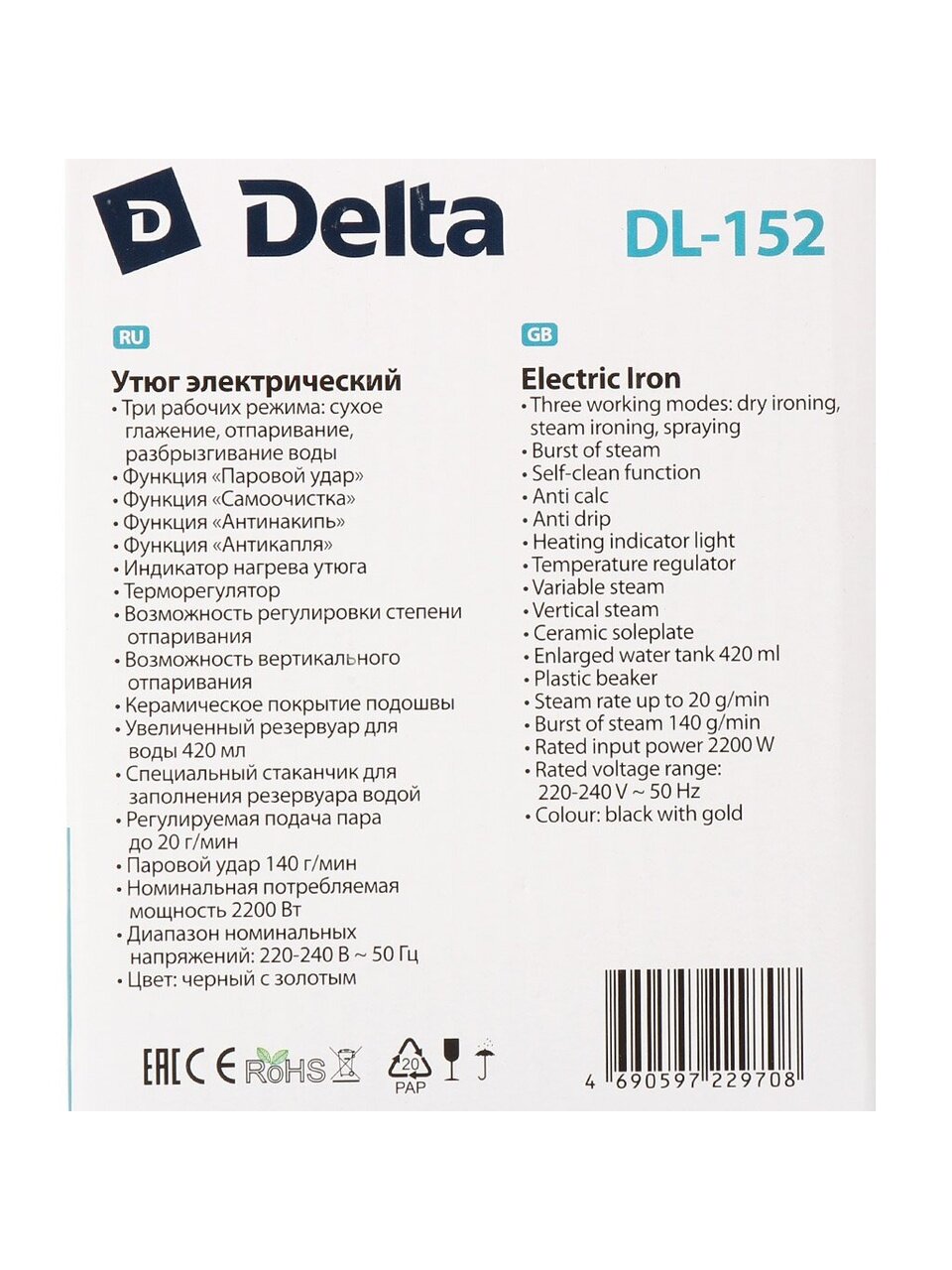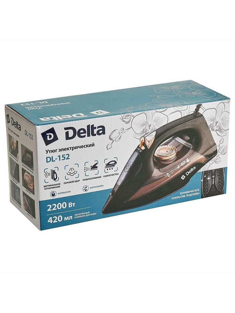 Вы можете приобрести «Утюг Delta, DL-152, 2200 Вт, керамика, антинакипь, 1.9 м, черный с золотым» и другие товары в нашем интернет-магазине в Таганроге по низким ценам и с бесплатным самовывозом.