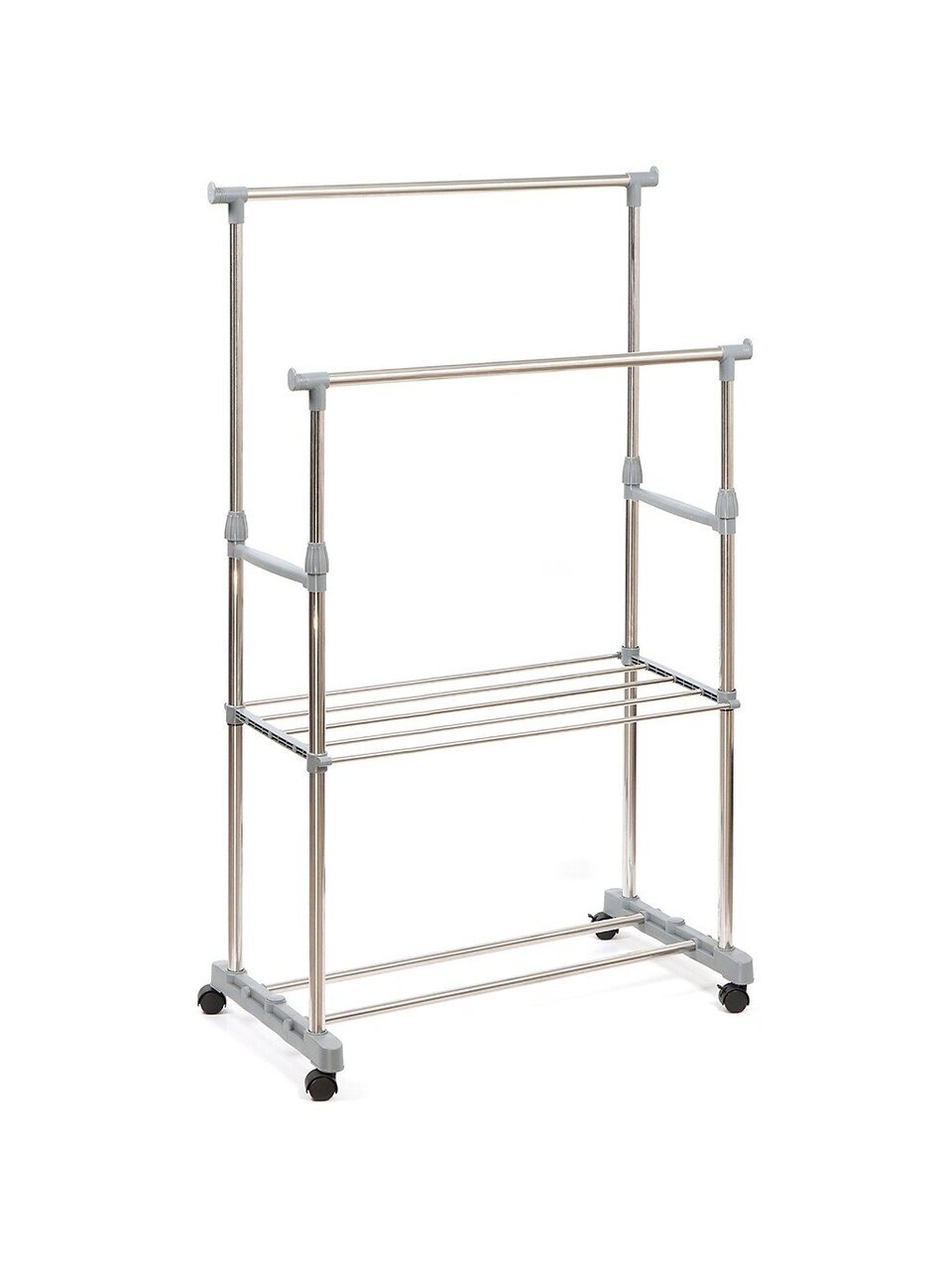 Телескопическая система позволяет регулировать высоту под разные типы одежды, а колеса обеспечивают мобильность — легко перемещать даже в загруженном состоянии.