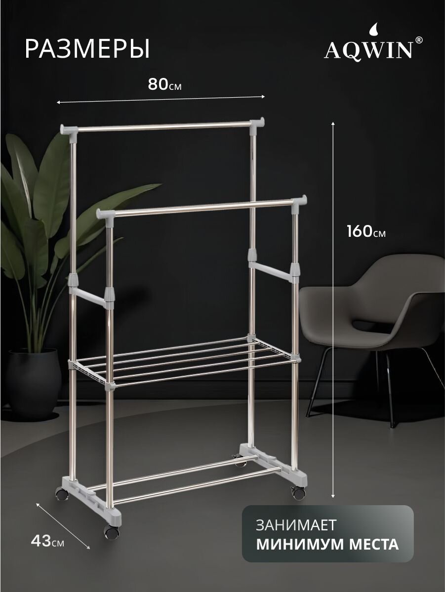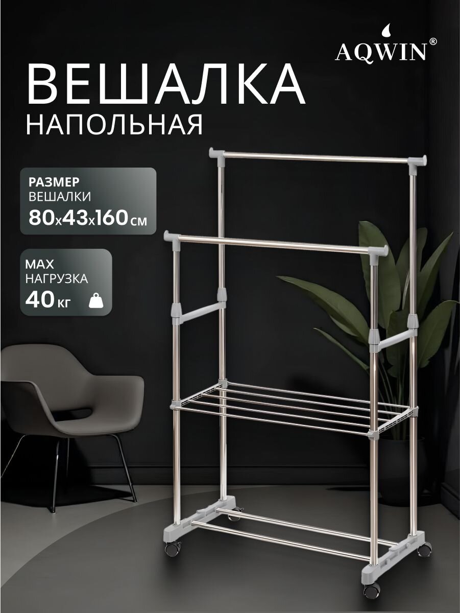 Вешалка напольная Aqwin 80х43х160 см: мобильное хранение до 40 кг, телескопическая рама, металл — оптимальное решение для порядка в доме и на даче.