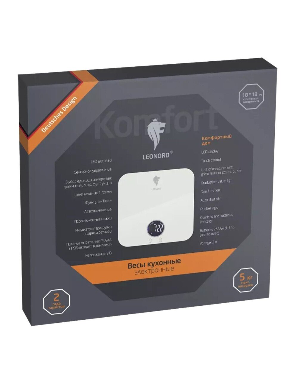Весы кухонные электронные Leonord LE-1713 — стильное и современное решение для точного взвешивания ингредиентов на кухне. Белый цвет корпуса и стеклянная платформа гармонично впишутся в любой интерьер, придавая рабочей зоне аккуратность и элегантность. Благодаря высокой точности измерения от 1 грамма и максимальной нагрузке до 5 кг, прибор станет незаменимым помощником для приготовления блюд, выпечки, заготовок и контроля порций. LED-дисплей обеспечивает четкое отображение результата, что особенно удобно при работе с мелкими ингредиентами или в условиях недостаточного освещения. Электронные весы Leonord LE-1713 — выбор тех, кто ценит комфорт, надежность и стиль в каждой детали.