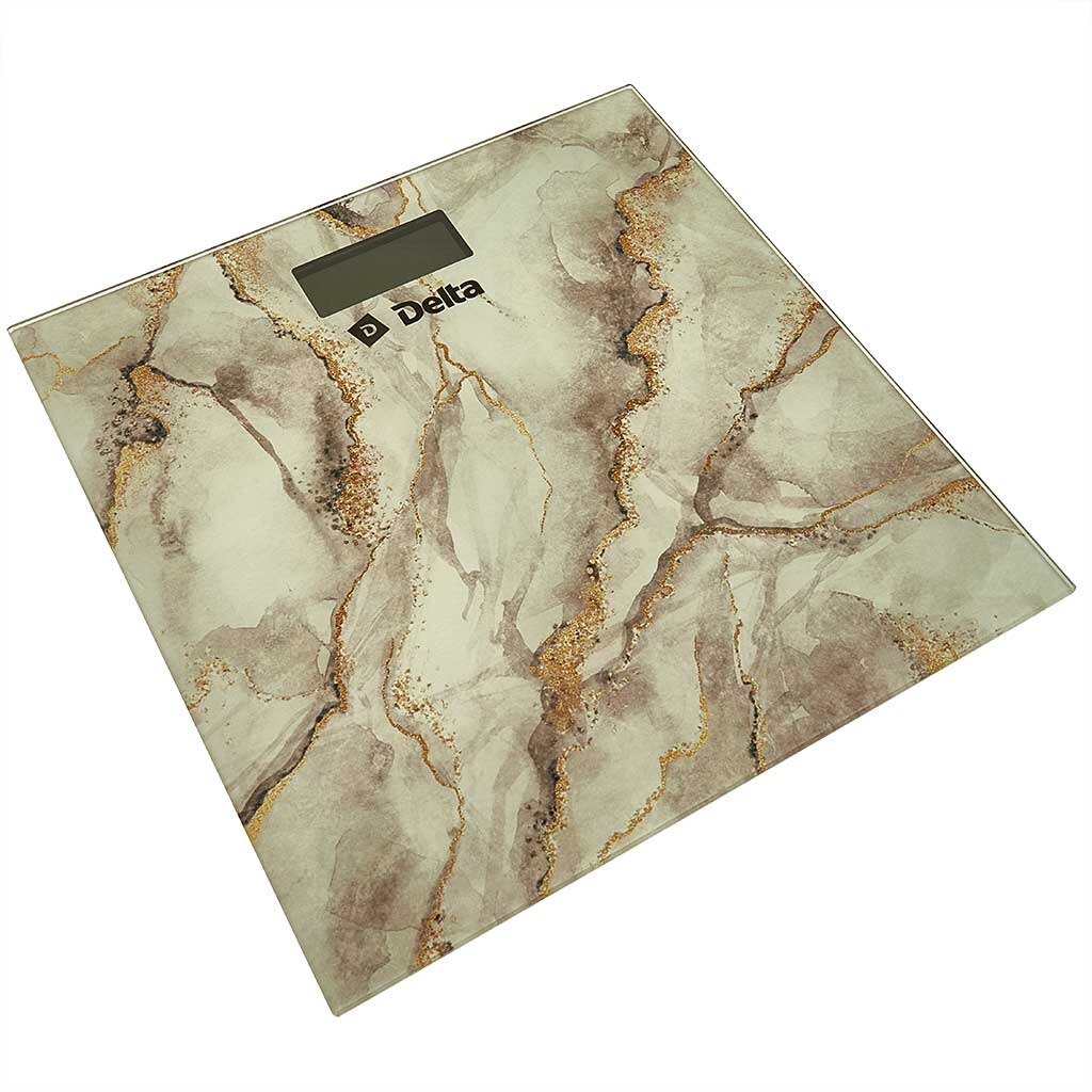 Электронные напольные весы Delta D-9015: точное измерение веса до 180 кг, стиль «белый мрамор», безопасное стекло, LCD-дисплей — идеальный выбор для дома и подарка.
