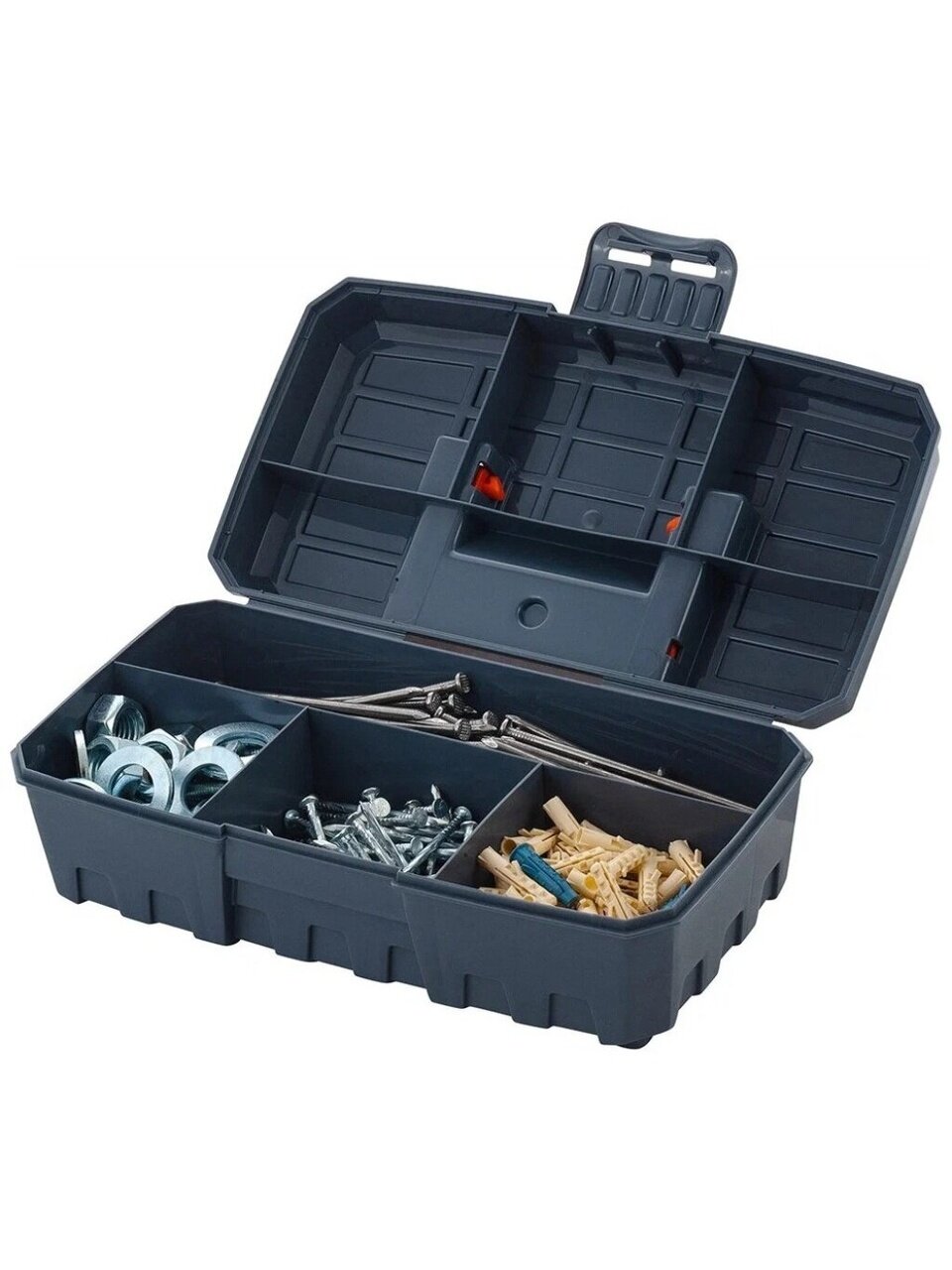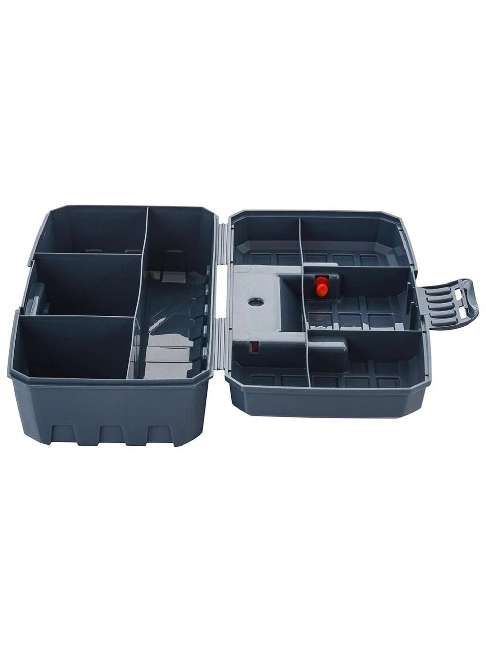 Бокс для хранения помогает содержать в порядке, переносить на место выполнения работ и быстро находить метизы и аксессуары. Идеален для использования дома, на даче, в гараже, мастерской, в автомобиле. Внутреннее деление на 4 отсека делает удобным размещение внутри органайзера деталей, которые необходимо отделить друг от друга. Компактен благодаря складной ручке. Подходит для хранения рыболовных и швейных принадлежностей, коллекционирования, занятия хобби, а также для использования в качестве аптечки.