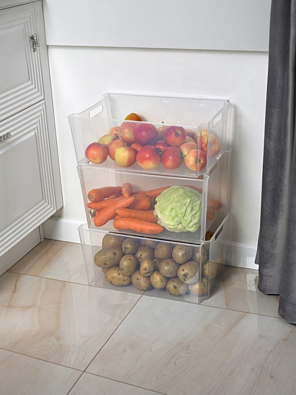 Благодаря специальной конструкции крышек и пазам на нижней поверхности, ящики можно штабелировать друг на друга, как с крышками так и без. Изделие имеет ручки с двух сторон, что удобно для использования и переноски. Крышка надежно защёлкивается на ящике, предотвращая тем самым выпадение содержимого. Каждое изделие укомплектовано декоративной наклейкой, демонстрирующей свойства продукта и варианты использования.