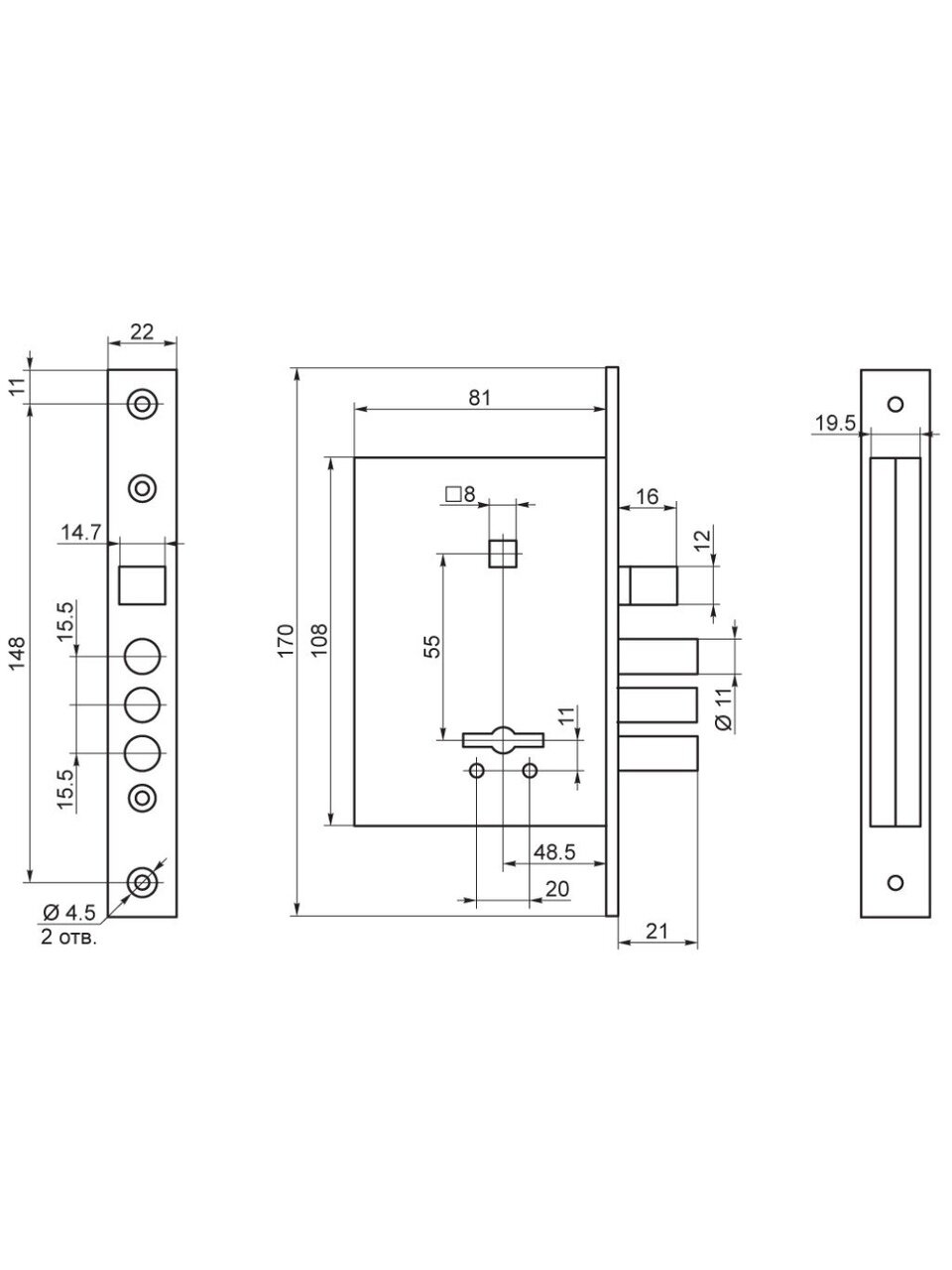 - Удаление ключевого отверстия: 48,5 мм.