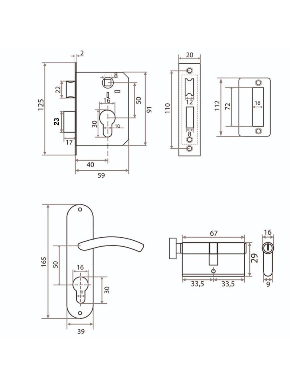 - Комплектация: ручка на планке 2 шт, корпус замка, цилиндровый механизм, ответная планка 1 шт, ключи 5 шт, квадрат, крепежный комплект.