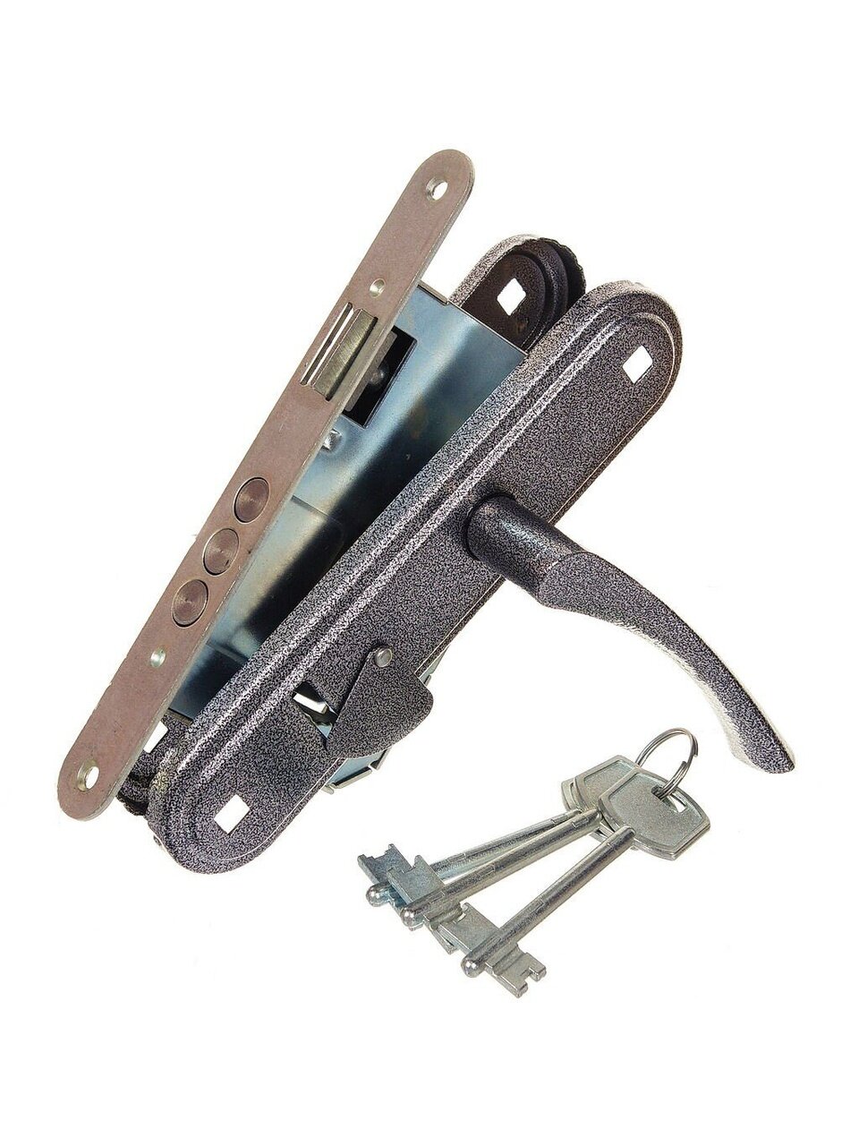 Замок врезной сувальдный универсальный с тремя стальными цилиндрическими ригелями диаметром 12 мм и защелкой класс 2 ГОСТ 5089-2011. Ручки-накладки покрыты полимерной краской. В ручки фалевые добавлены пружины и фиксаторы, что исключает «провисание» ручек и обеспечивает четкую фиксацию их положения.
