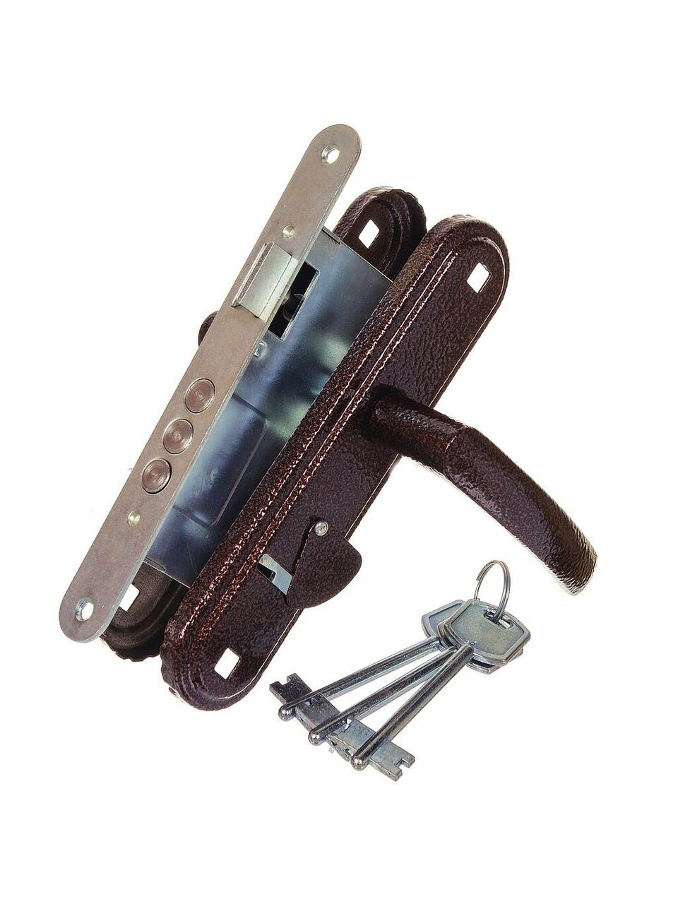 Замок врезной сувальдный с межосевым расстоянием 67 мм, удаление отверстия под ключ 55 мм. Засов из 3 стальных цилиндрических ригелей диаметром 12 мм. Ручки-накладки покрыты полимерной краской. В ручки фалевые добавлены пружины и фиксаторы, что исключает провисание ручек и обеспечивает четкую фиксацию их положения. Замок предназначен для установки в деревянные и стальные двери толщиной до 50 мм, правого и левого открывания. Комплектуется 3-мя ключами, ответной планкой и крепежной фурнитурой.