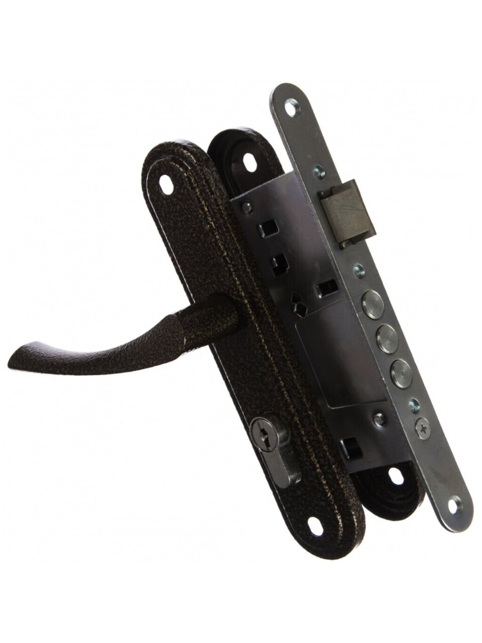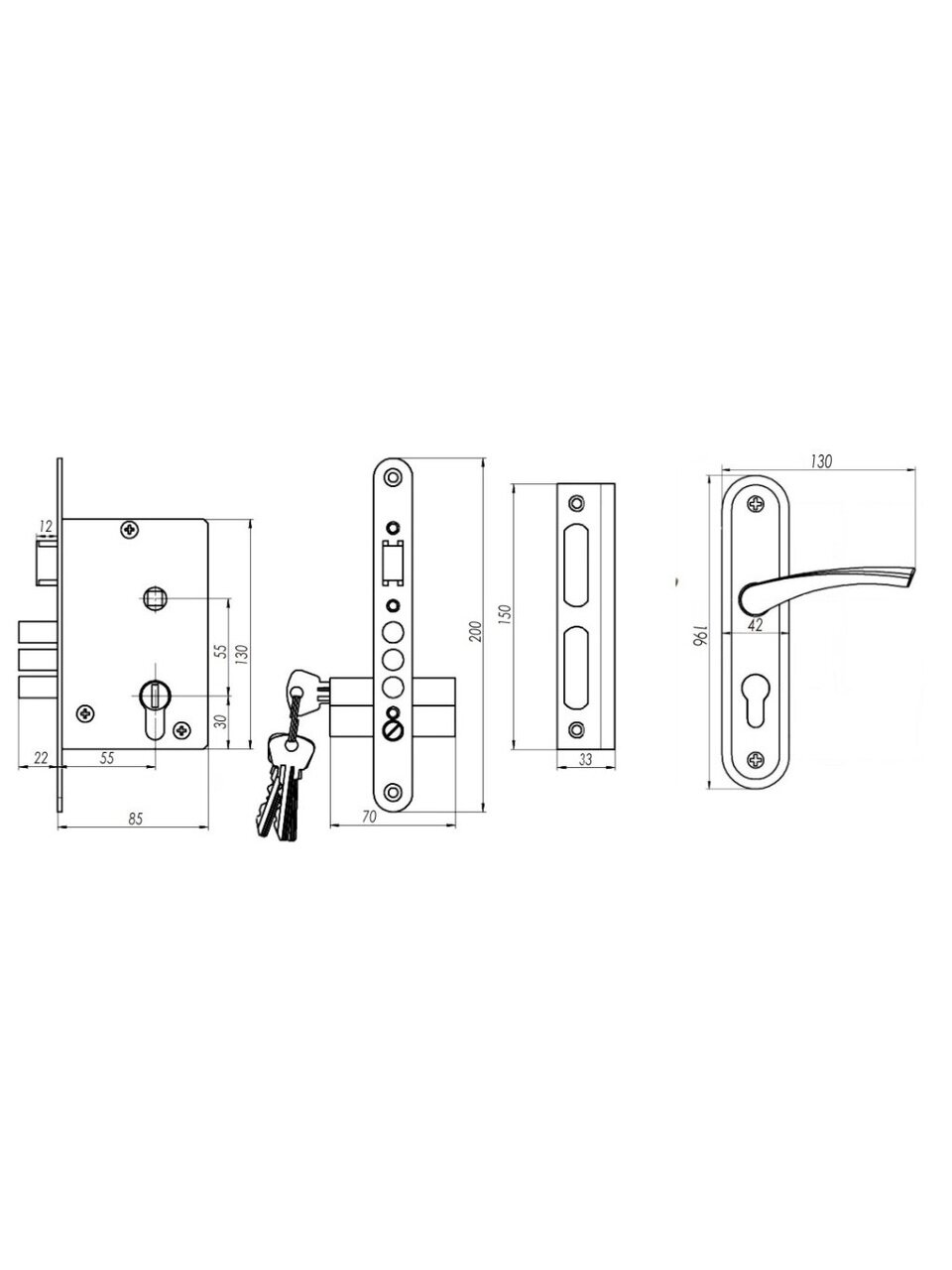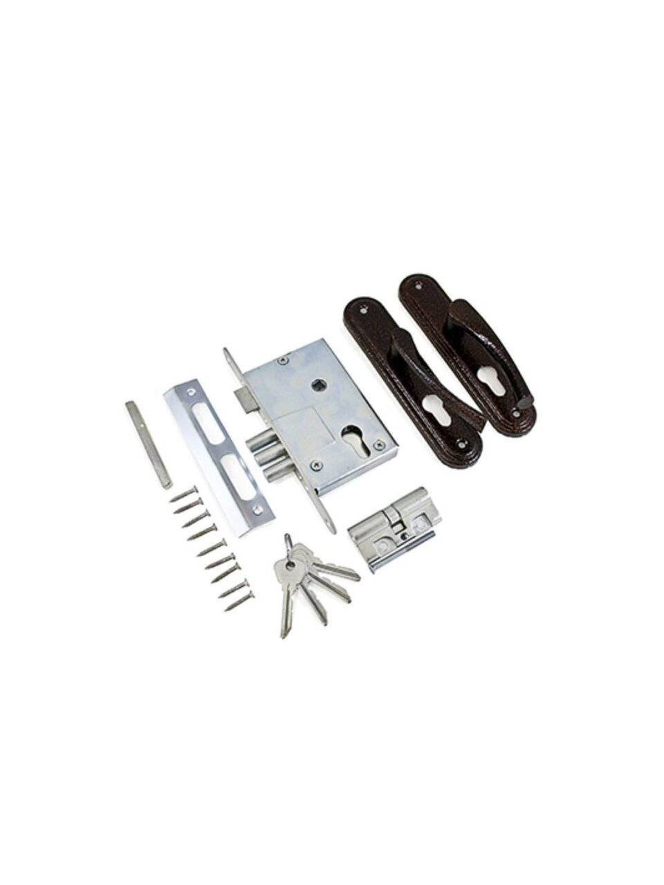 - Комплектность: замок, цилиндровый механизм 70 мм, ответная планка, ручки на планке, комплект крепежа