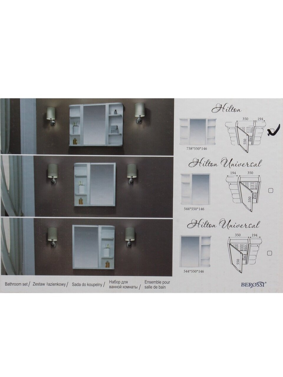 Зеркало-шкаф Berossi Hilton не только украсит ванную, но и обеспечит удобное хранение необходимых принадлежностей. Встроенные полки позволяют разместить косметику, средства гигиены и аксессуары, сохраняя порядок и легкий доступ к самым нужным вещам. Продукция бренда Berossi известна своим качеством и надежностью, что делает выбор в пользу этого набора особенно выгодным для покупателей, ценящих долговечные и функциональные решения для дома.