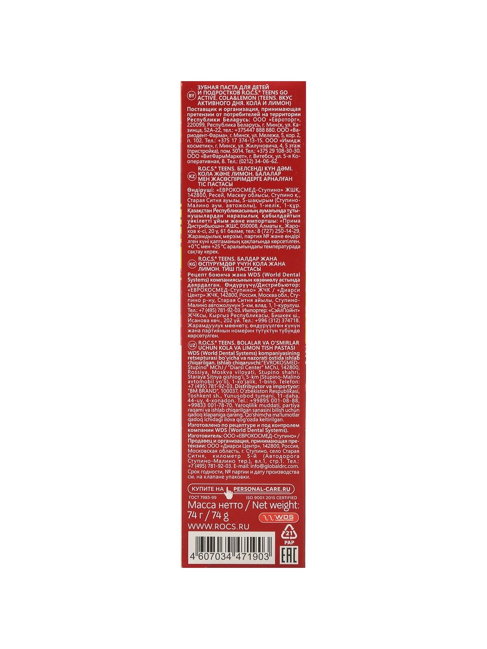 Зубная паста R.O.C.S. Teens, 74 г: свежесть колы и лимона для яркого дня, эффективная защита и уход за зубами подростков по выгодной цене