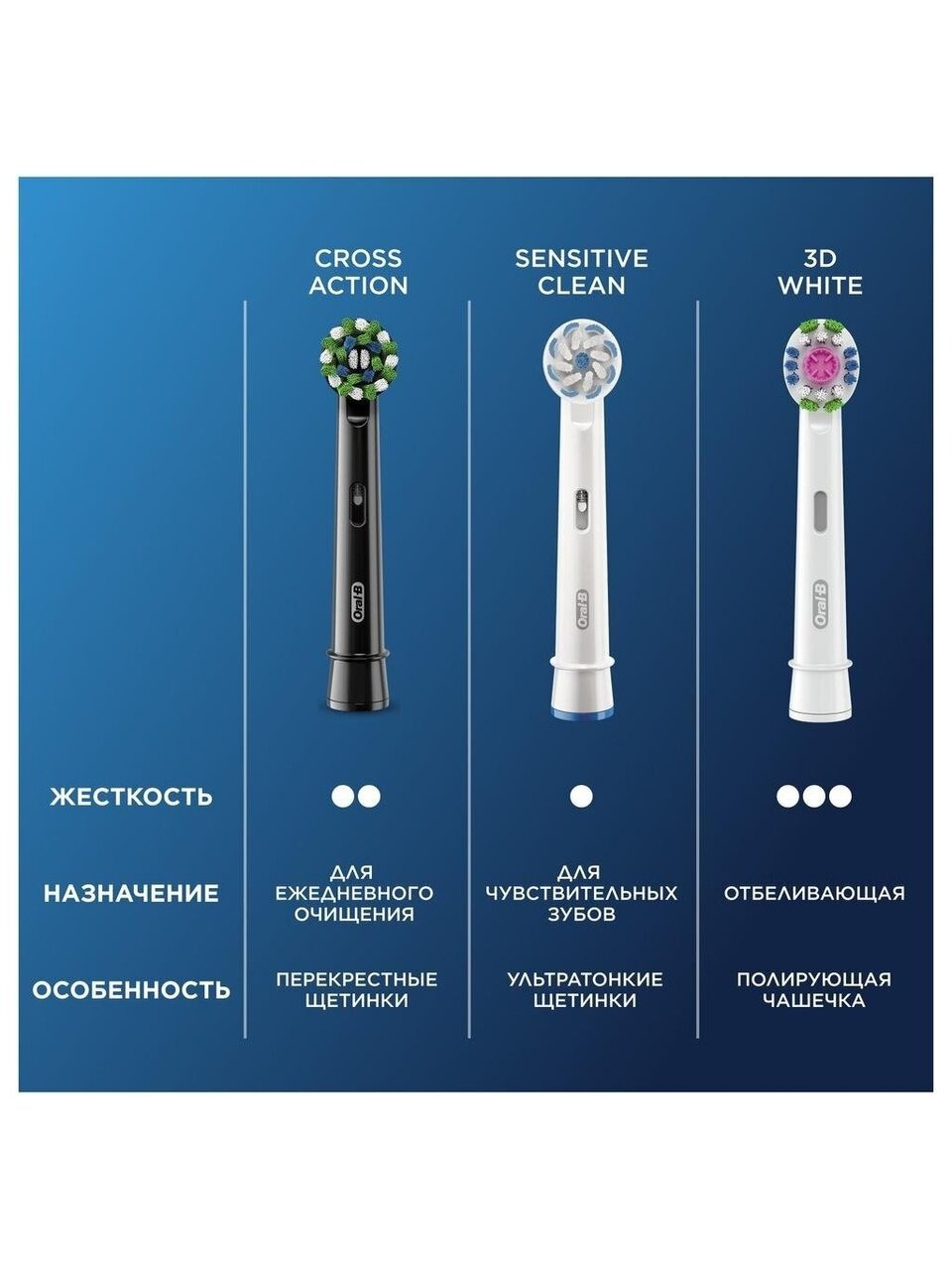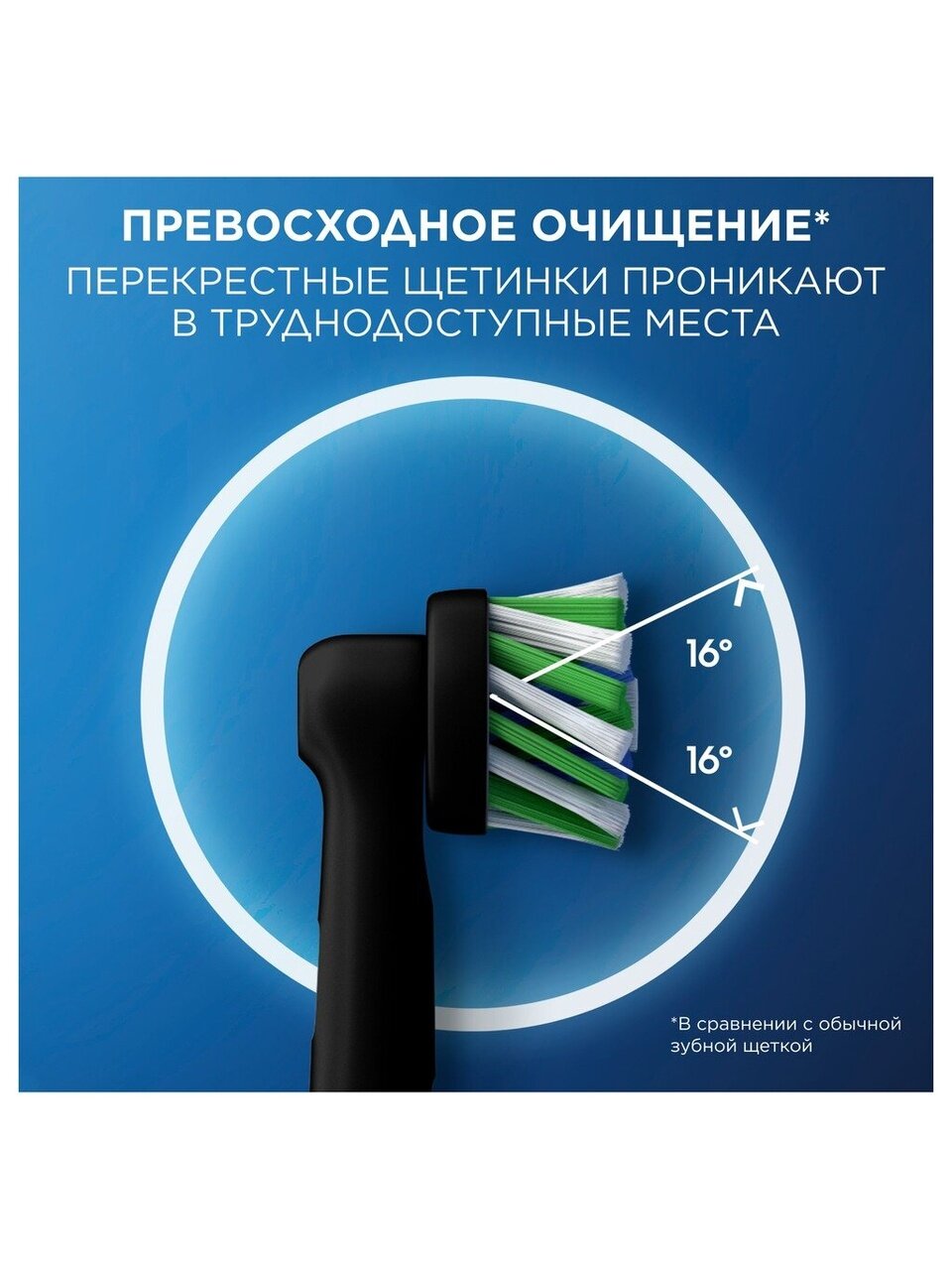 - технология CrossAction для тщательной очистки: насадки оснащены щетинками, расположенными под углом, что позволяет эффективно удалять зубной налет даже в труднодоступных местах.